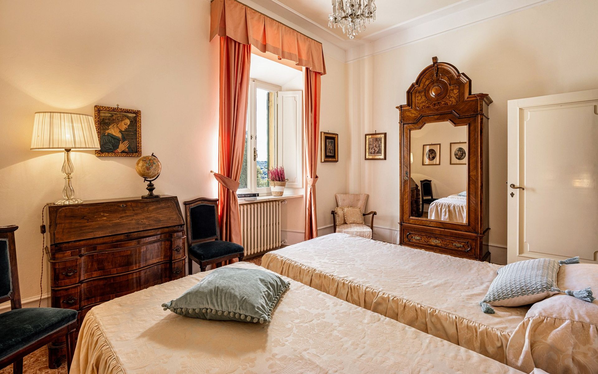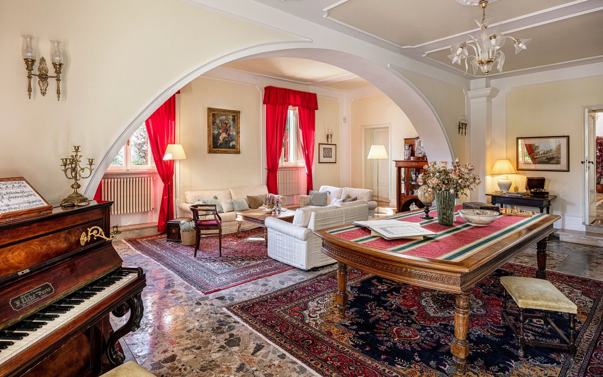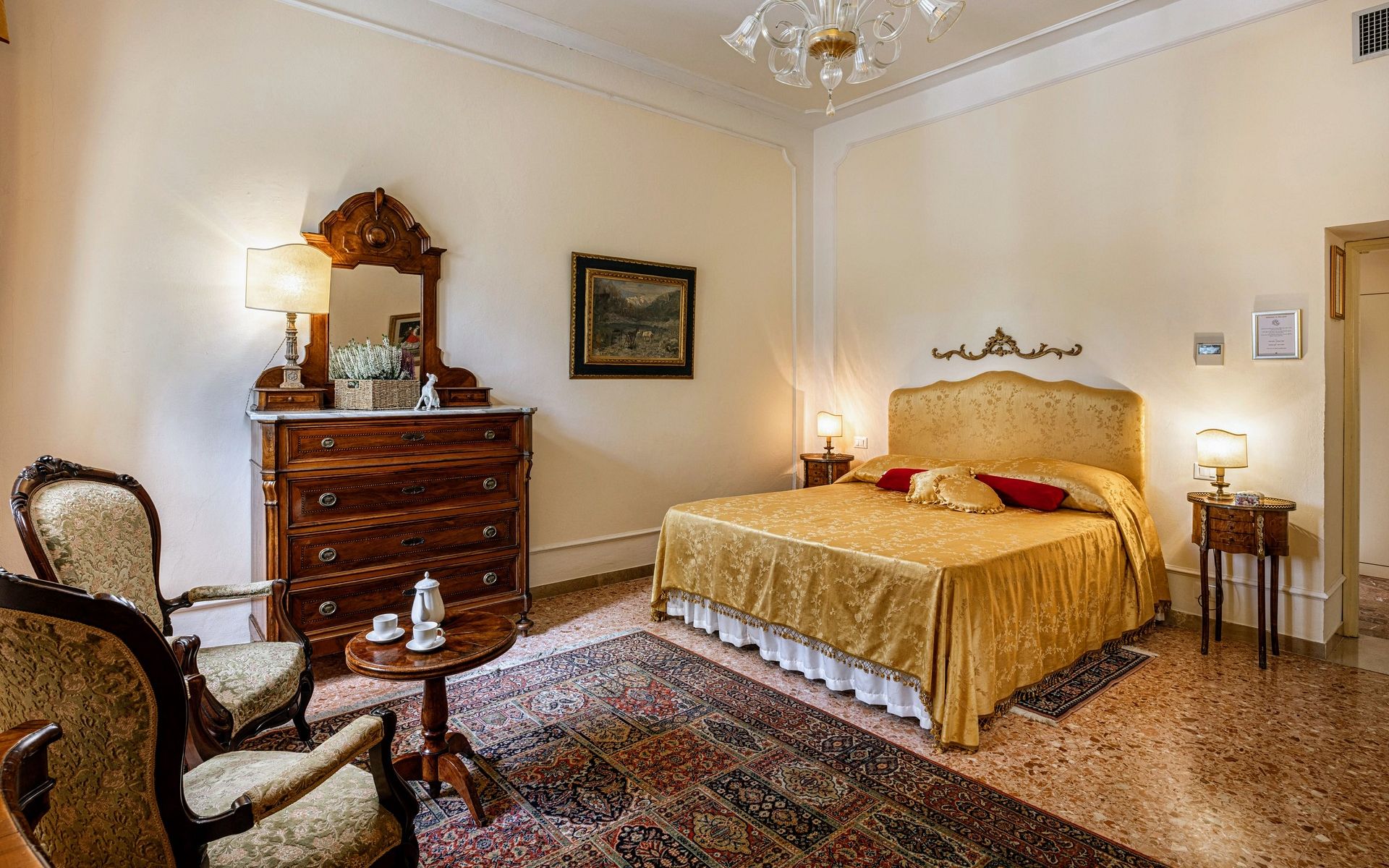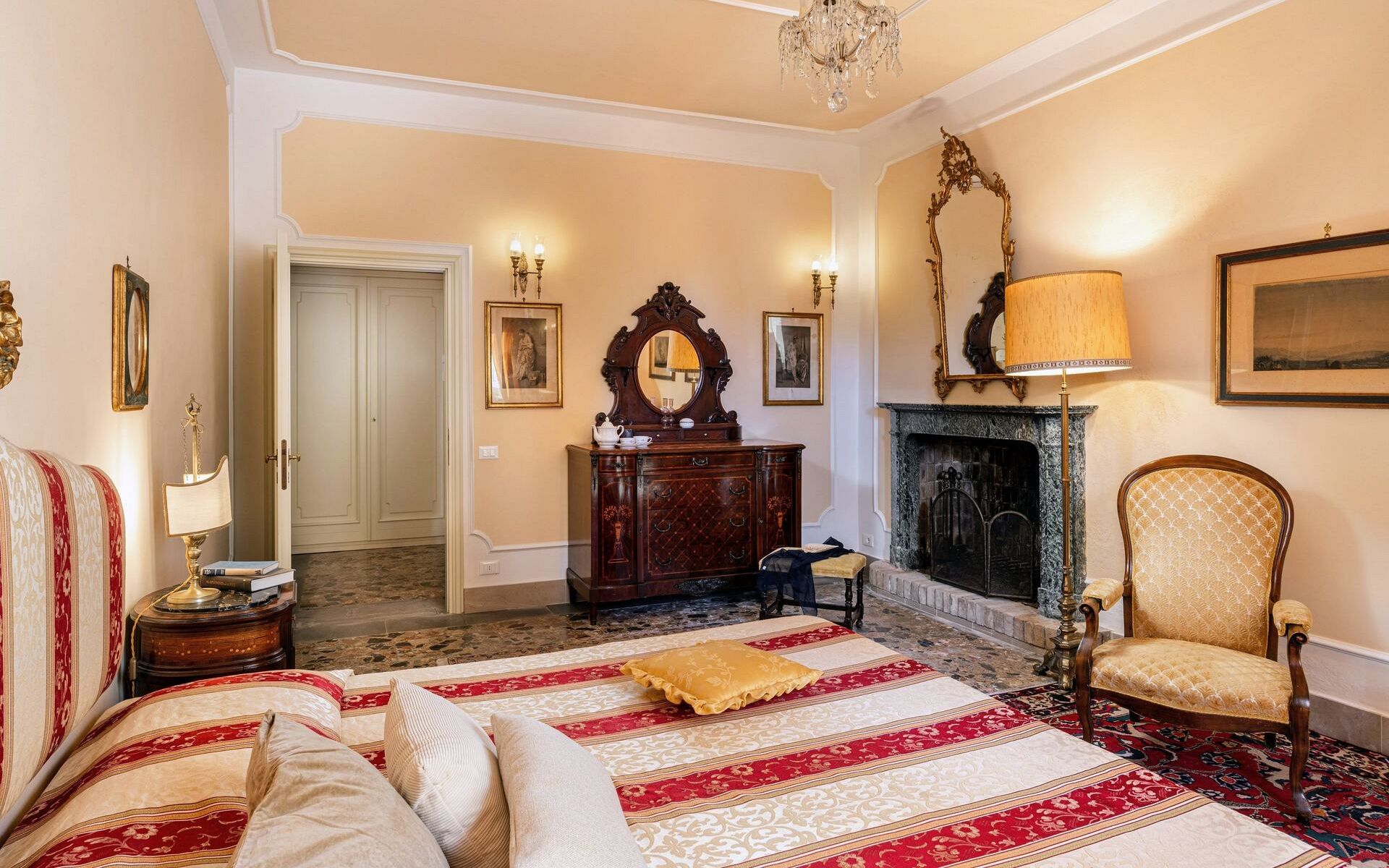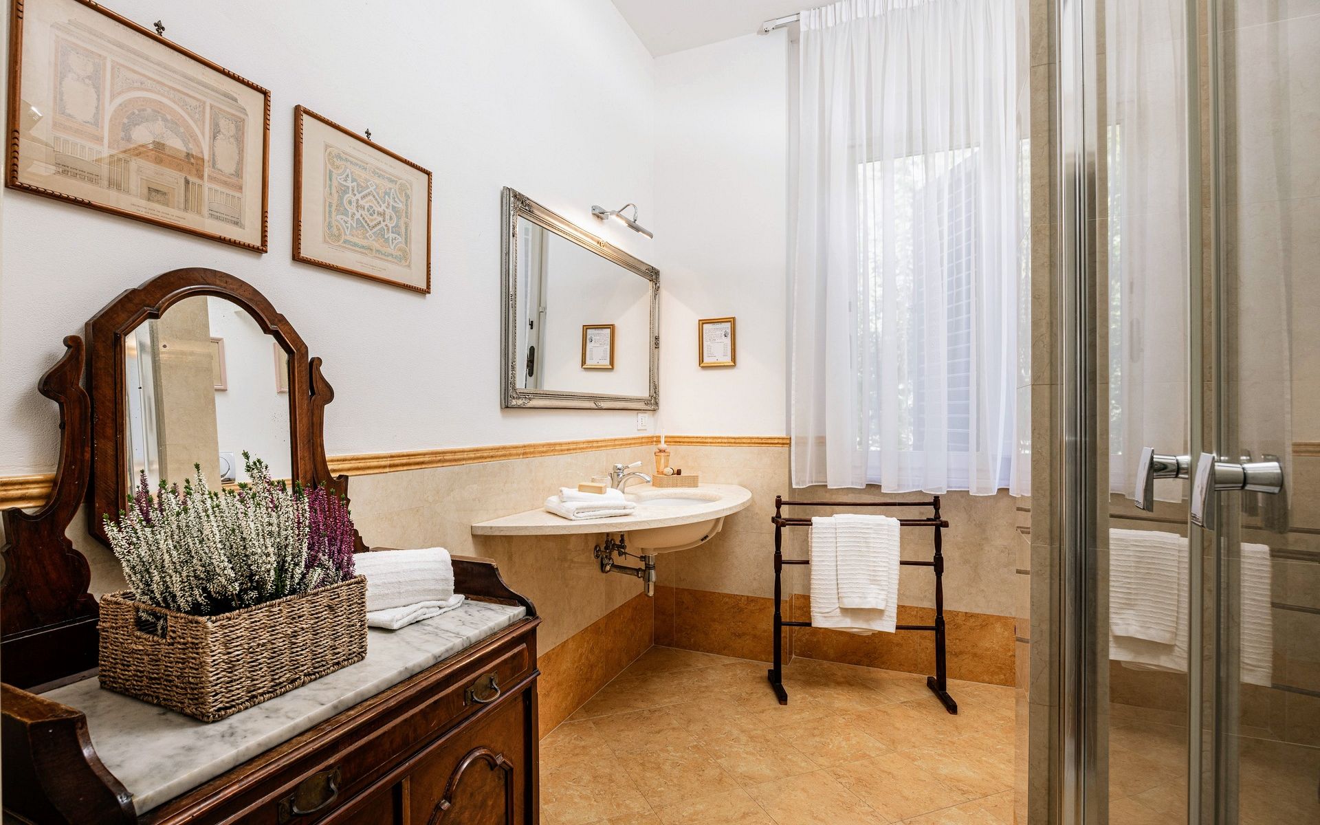 The ground floor shows the great rooms typical of the eighteen century villas inspired by the palladian style. On the right side of the large entrance there is a wide and bright living room which is the largest and the oldest room of the building. Featured by great vaults, is enhanced by a rare fireplace in green marble and is furnished with luxurious and antique furnitures. On the left side of the entrance there is the dining room and from there you can access to the kitchen, which has been completely renovated and is composed of a wide marble plan which allows a very comfortable cooking, it is also equipped with every kitchen tools and cooking technologies. On this floor there is available one double bedroom with bathroom with disabled facilities.
