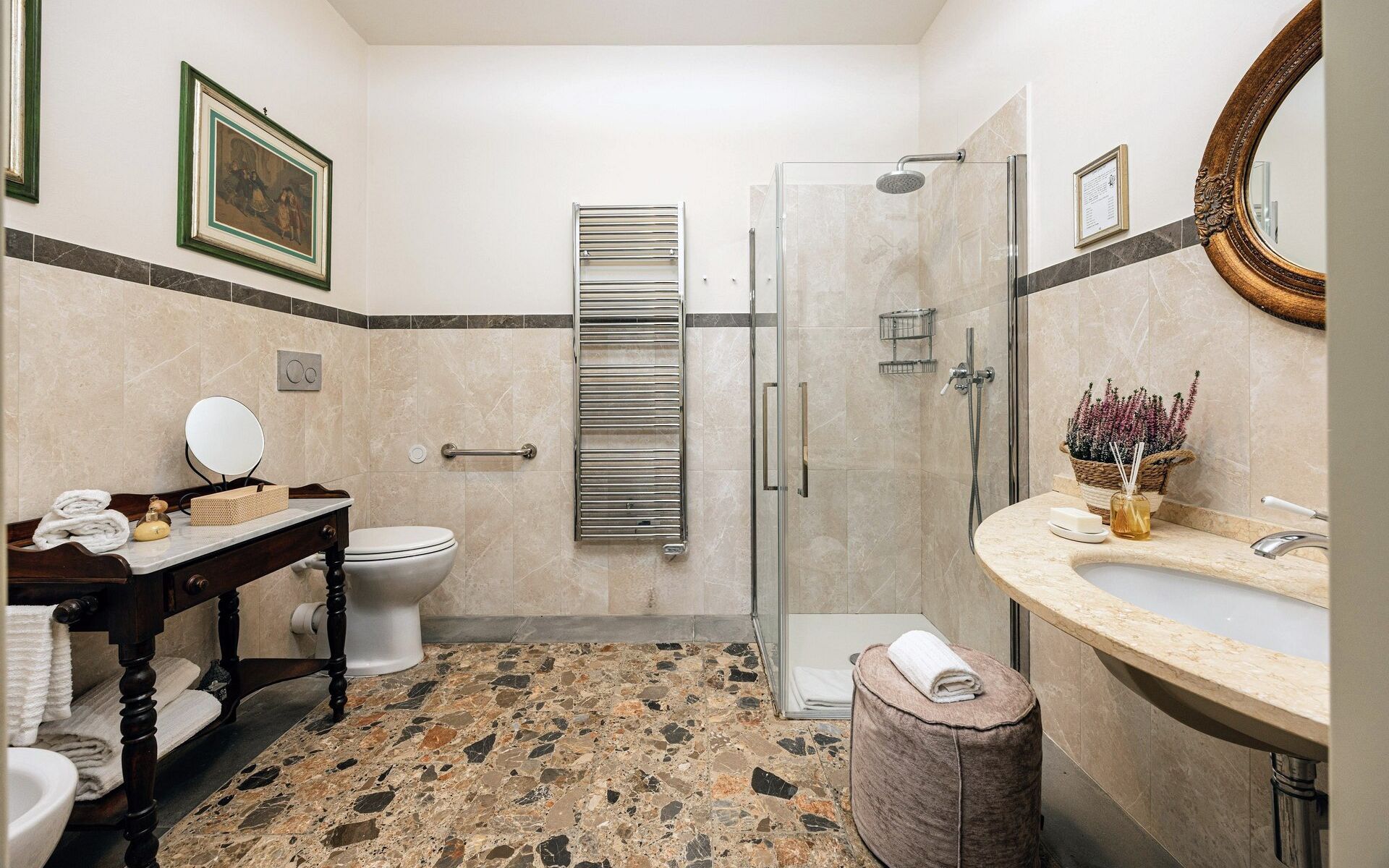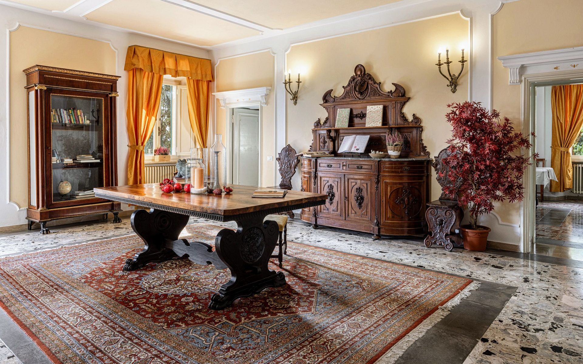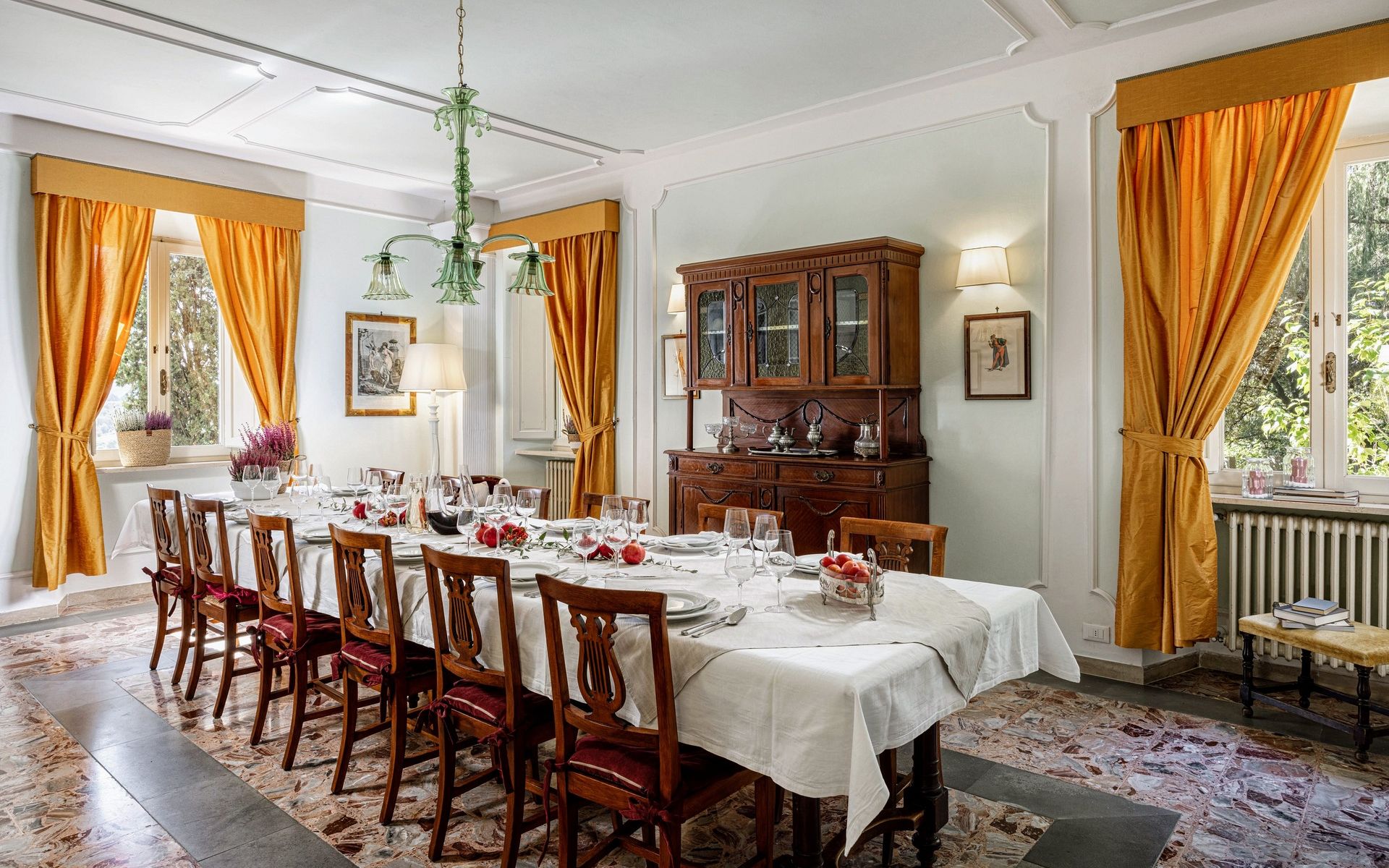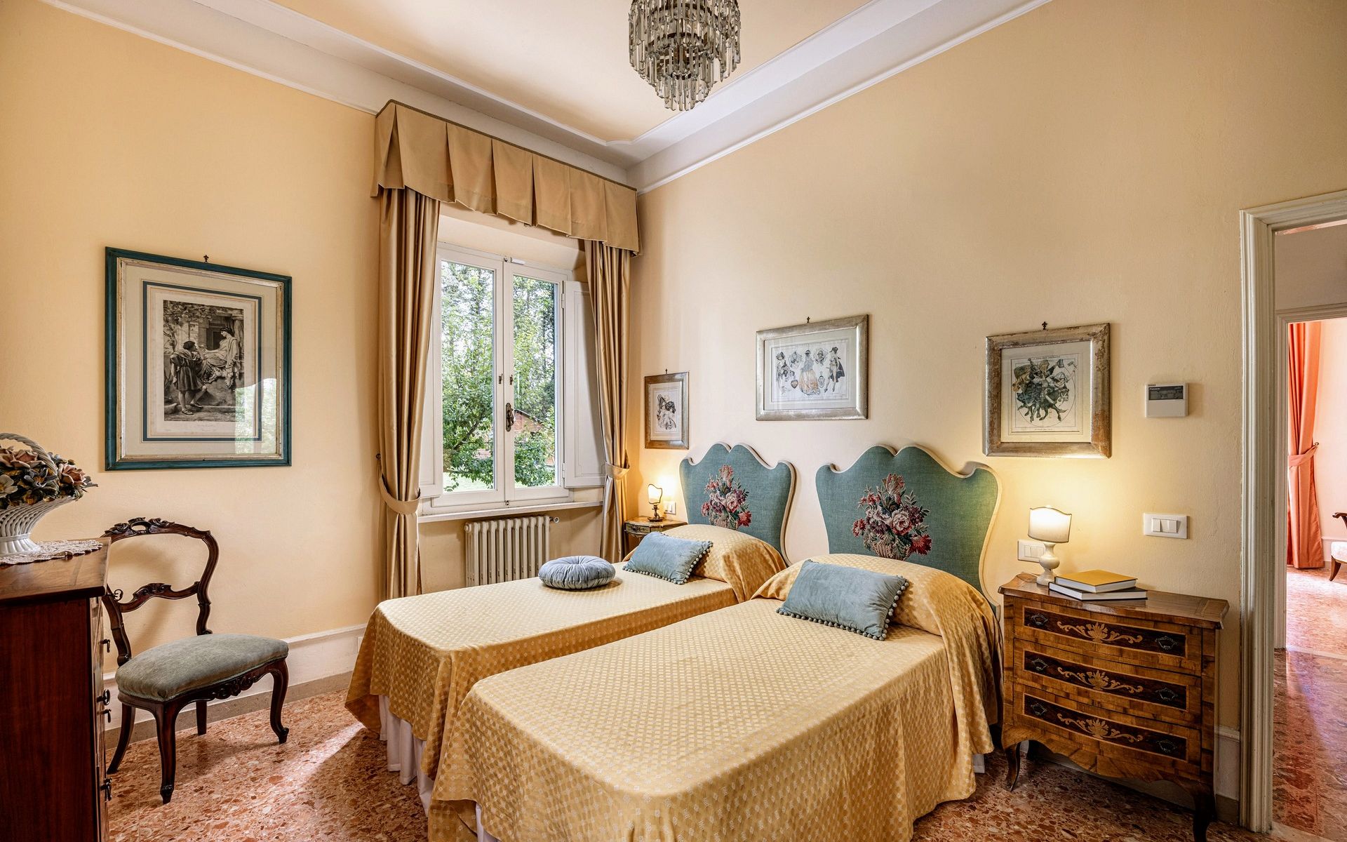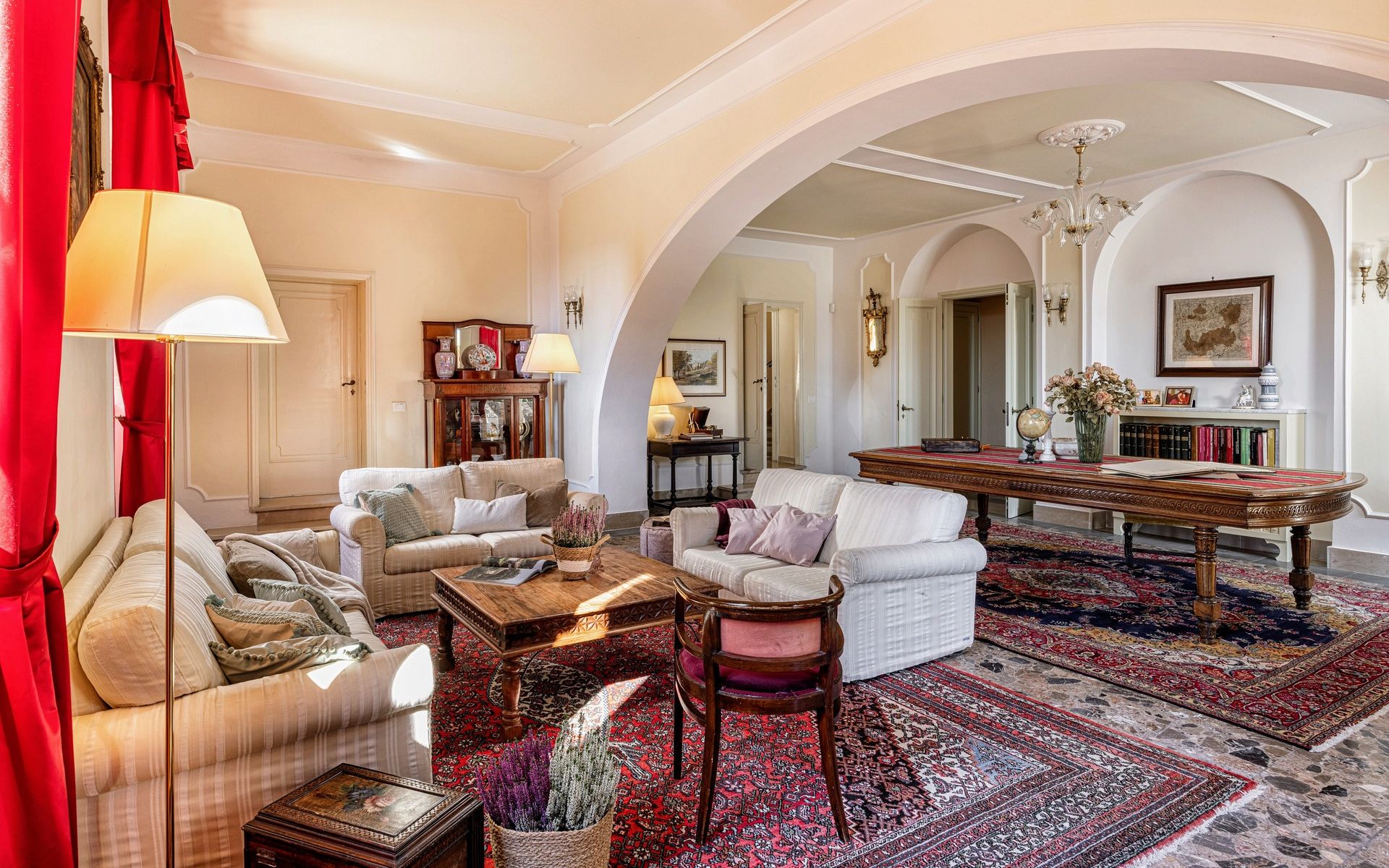 The ground floor shows the great rooms typical of the eighteen century villas inspired by the palladian style. On the right side of the large entrance there is a wide and bright living room which is the largest and the oldest room of the building. Featured by great vaults, is enhanced by a rare fireplace in green marble and is furnished with luxurious and antique furnitures. On the left side of the entrance there is the dining room and from there you can access to the kitchen, which has been completely renovated and is composed of a wide marble plan which allows a very comfortable cooking, it is also equipped with every kitchen tools and cooking technologies. On this floor there is available one double bedroom with bathroom with disabled facilities.