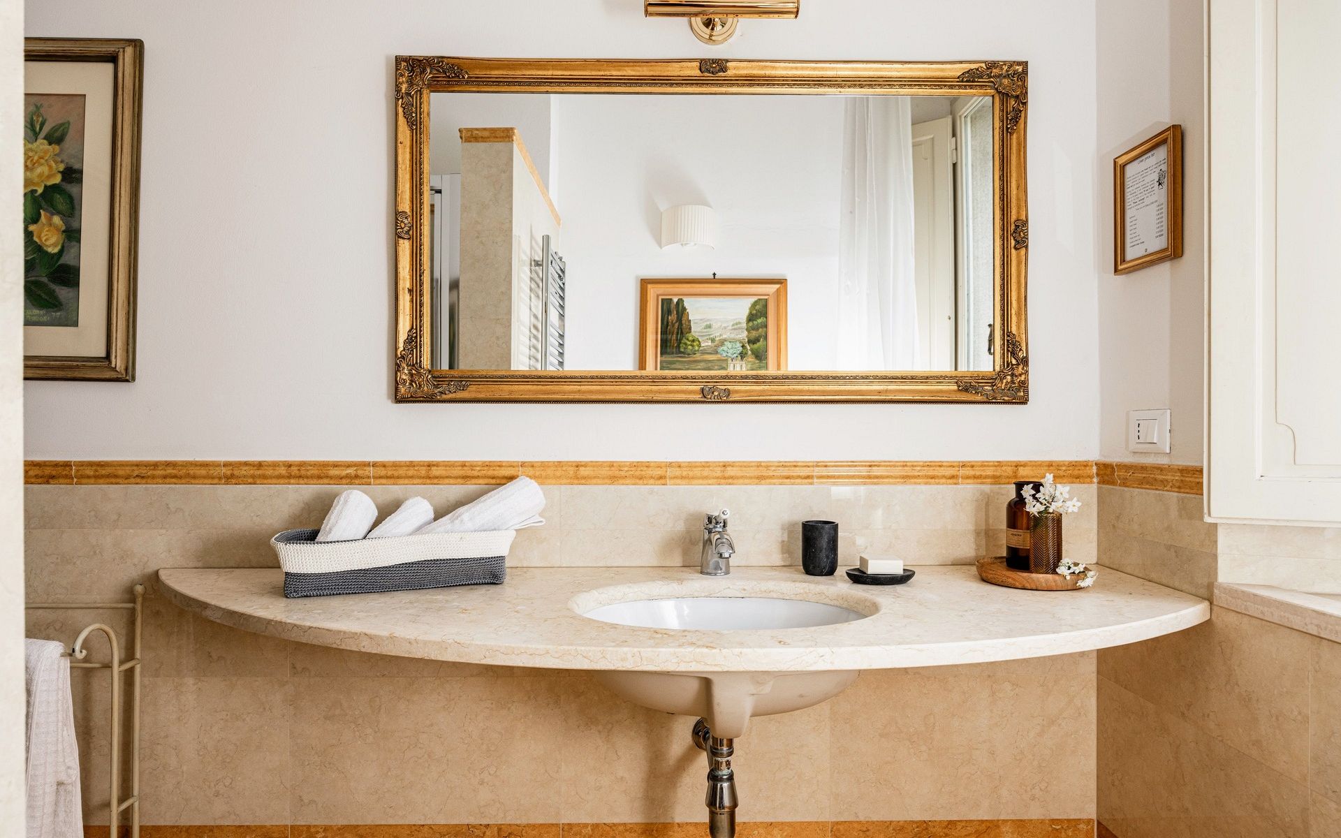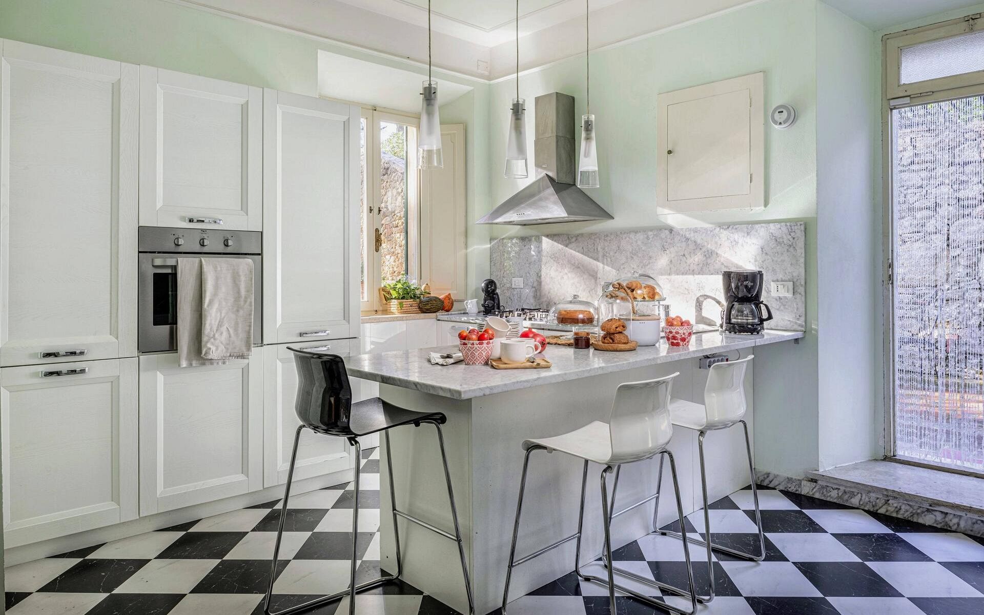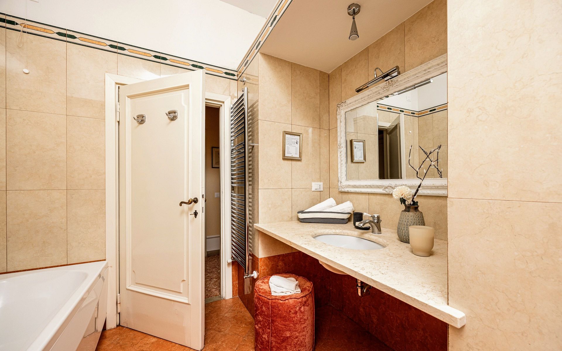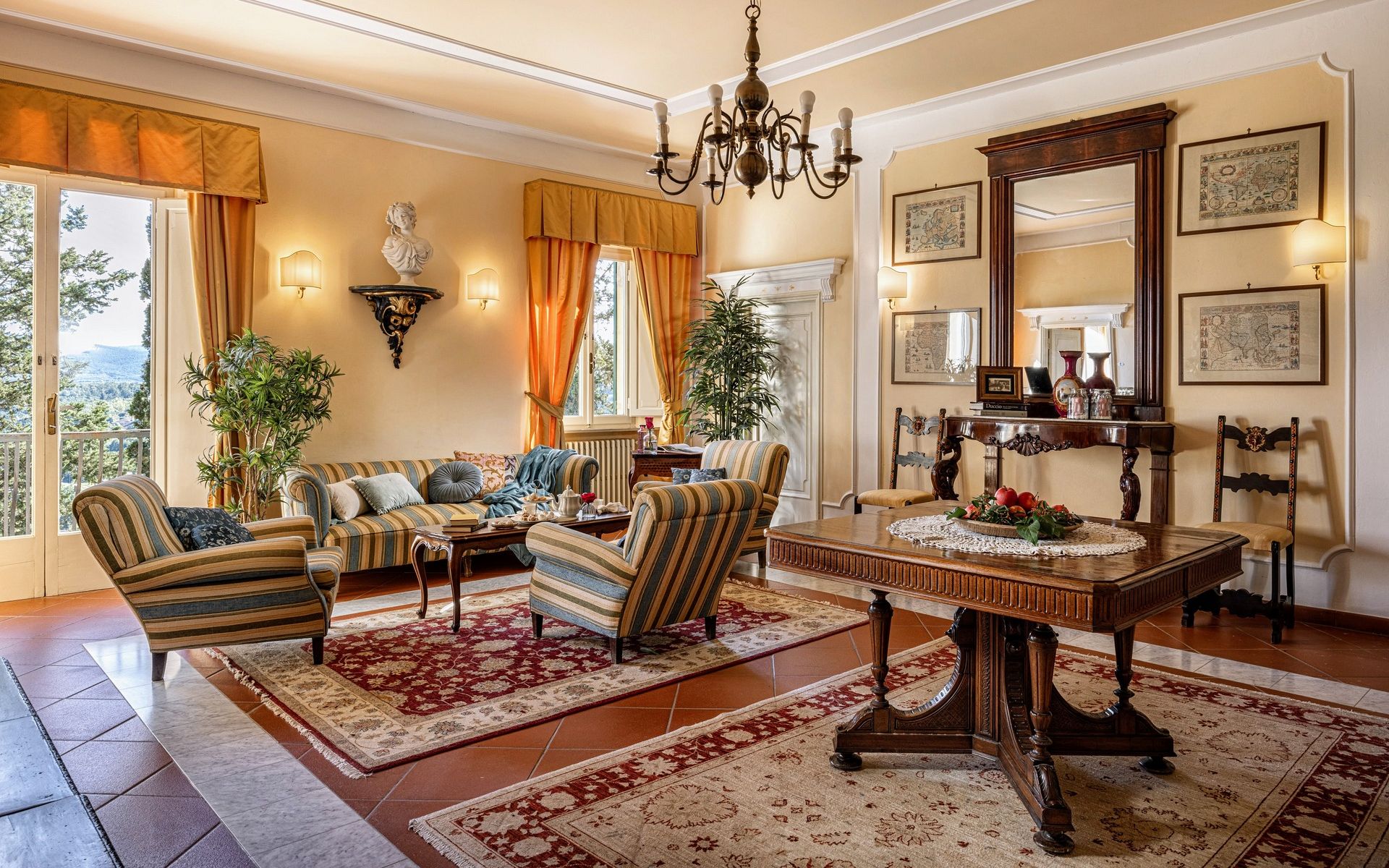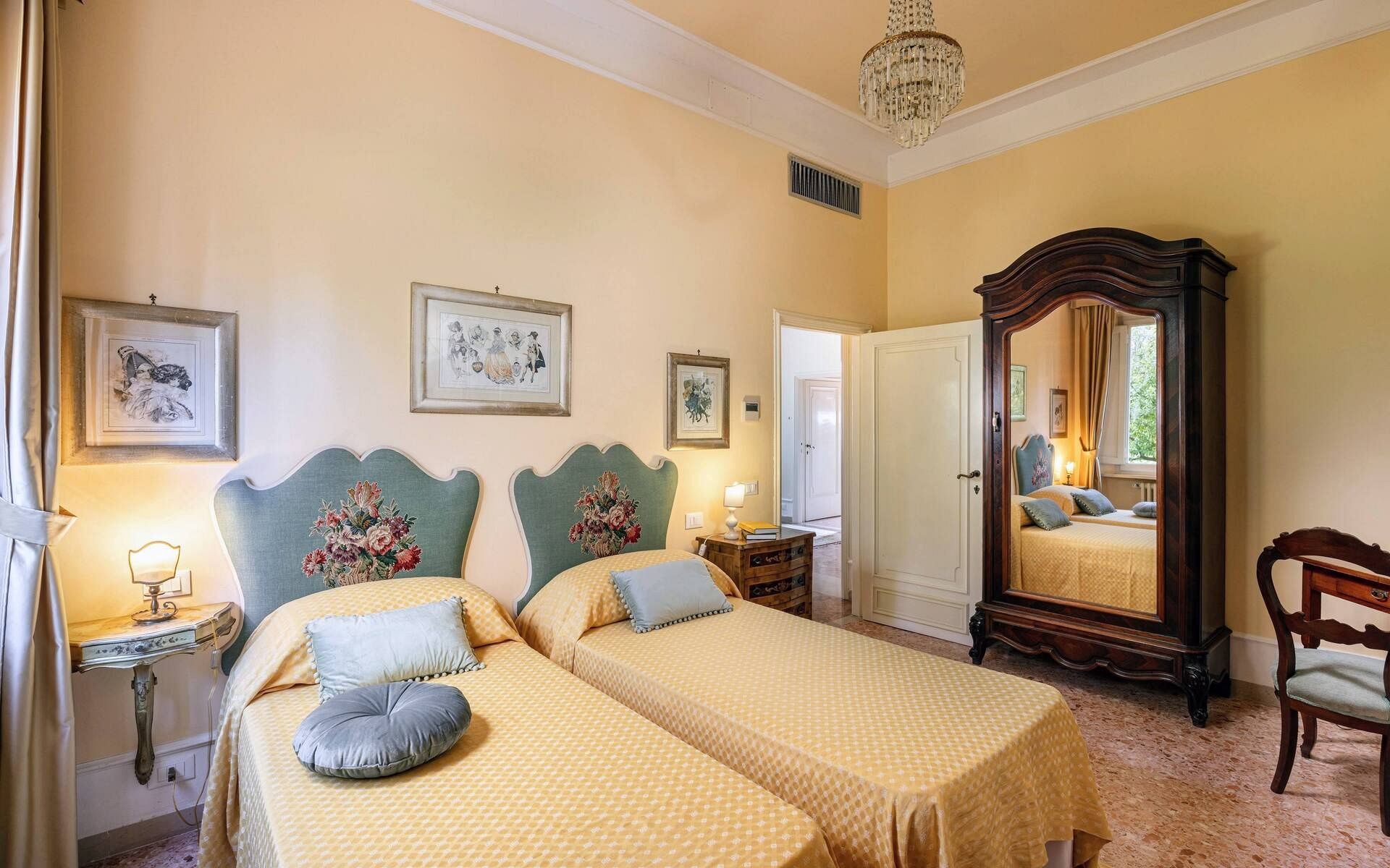 The ground floor shows the great rooms typical of the eighteen century villas inspired by the palladian style. On the right side of the large entrance there is a wide and bright living room which is the largest and the oldest room of the building. Featured by great vaults, is enhanced by a rare fireplace in green marble and is furnished with luxurious and antique furnitures. On the left side of the entrance there is the dining room and from there you can access to the kitchen, which has been completely renovated and is composed of a wide marble plan which allows a very comfortable cooking, it is also equipped with every kitchen tools and cooking technologies. On this floor there is available one double bedroom with bathroom with disabled facilities.