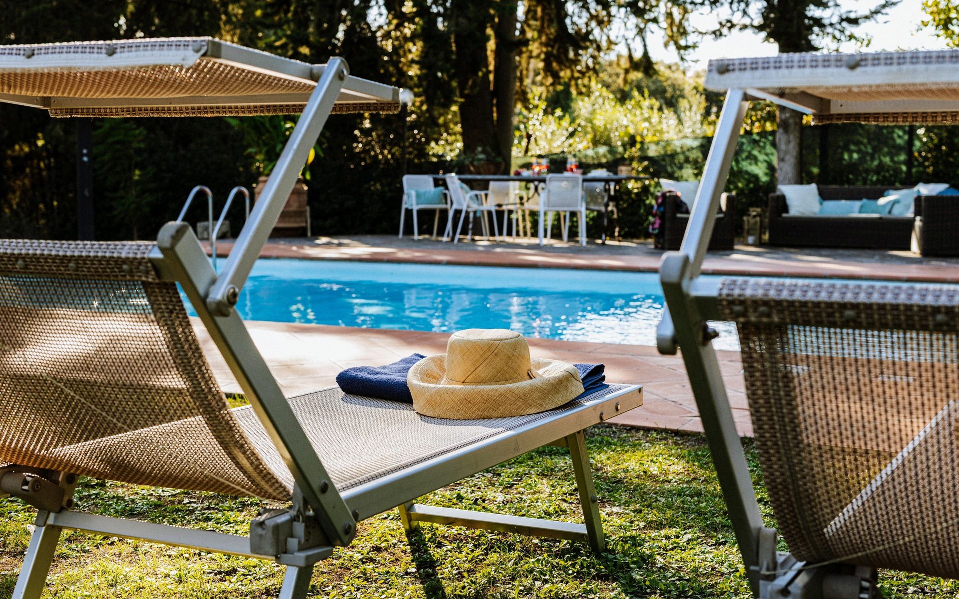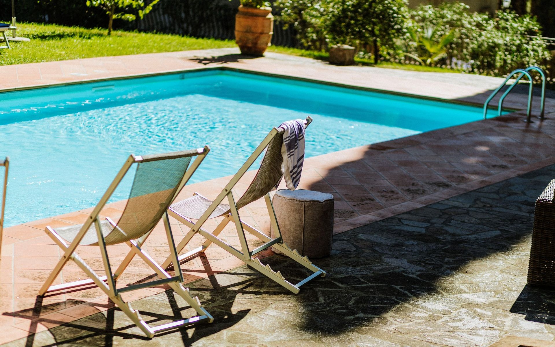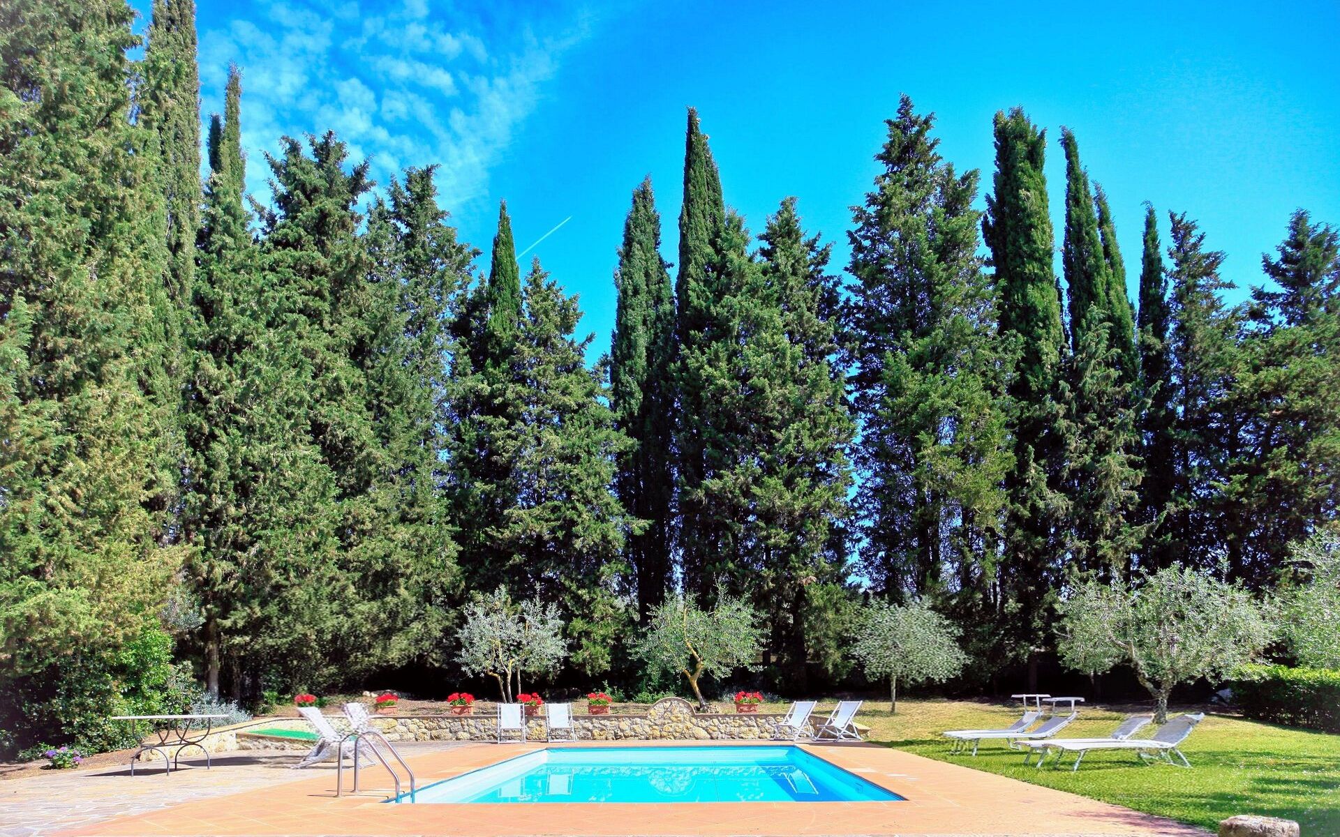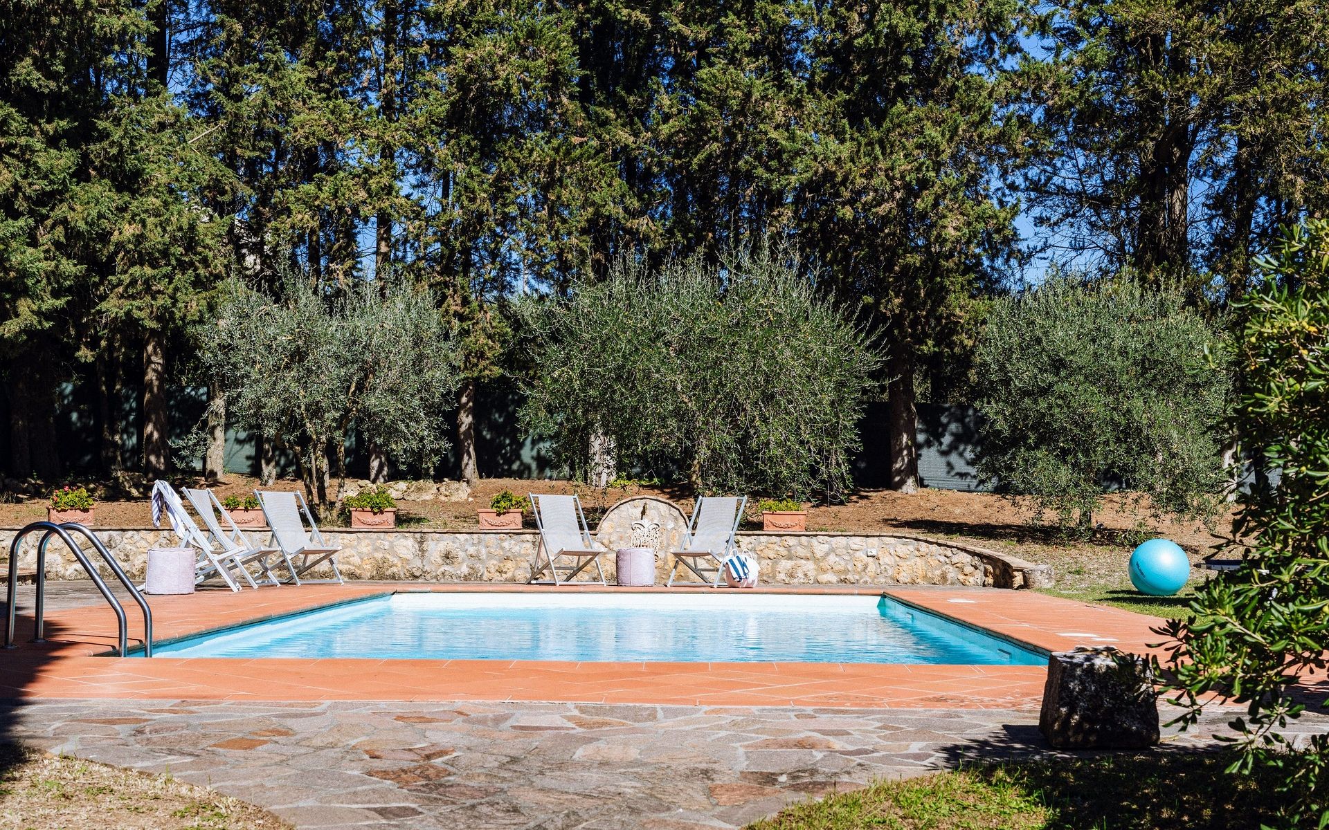 In a secluded area to the back of the villa, nestled among cypress and olive trees, is the swimming pool surrounded by a large green lawn. The pool (10 x 5 meters and 1,40-1,60 meters deep) is open from May 1st to October 31st.