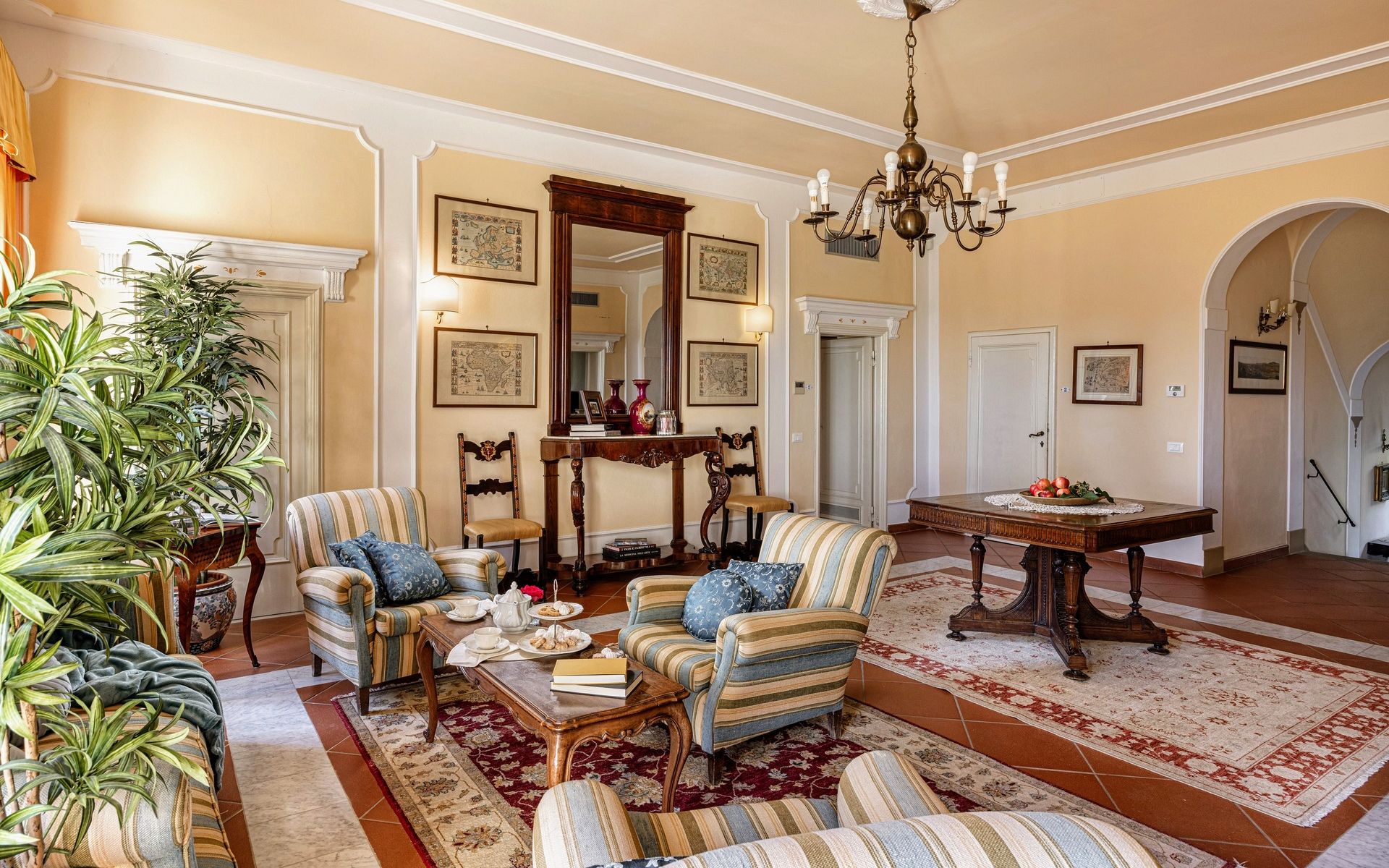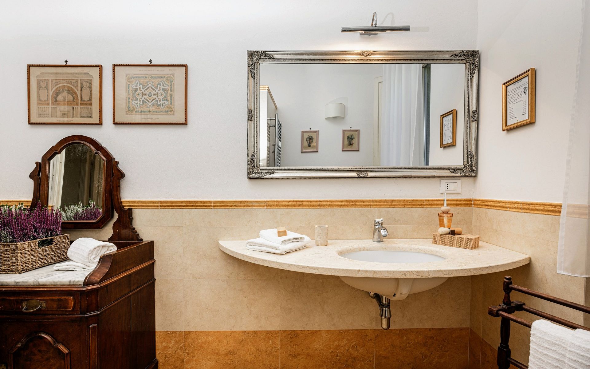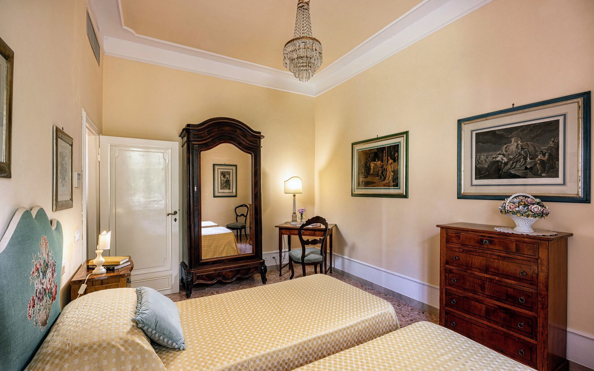 On the first floor there is the sleeping area. There are six rooms, all equipped with air conditioning. Two rooms have king size beds and private bathrooms. Other two rooms have queen size beds and private bathroom. The last two rooms have a shared bathroom, one with a double bed and one with two twin beds. Each room is furnished with elegant furniture dating back to the eighteen century in order to preserve the charm of an elegant atmosphere.