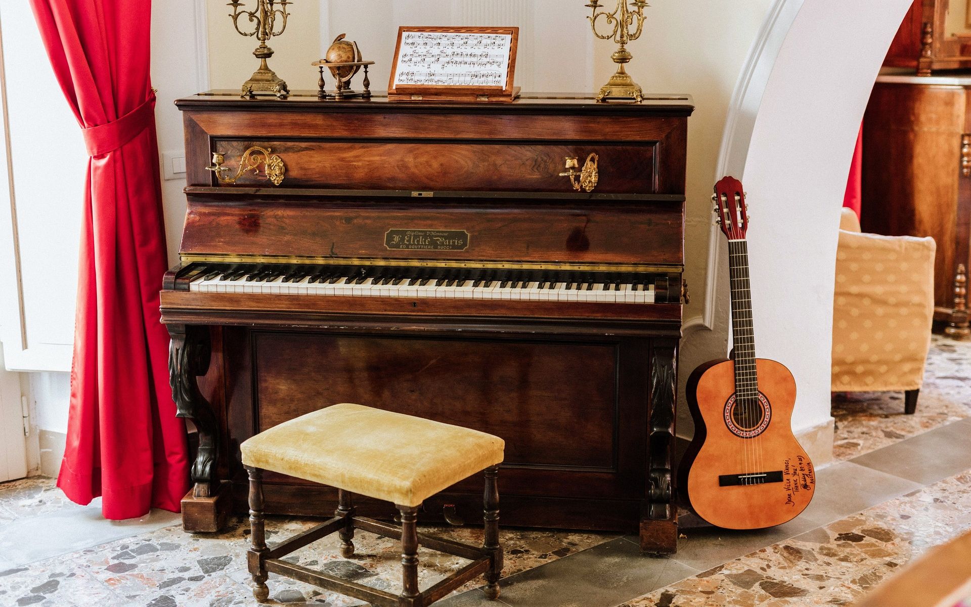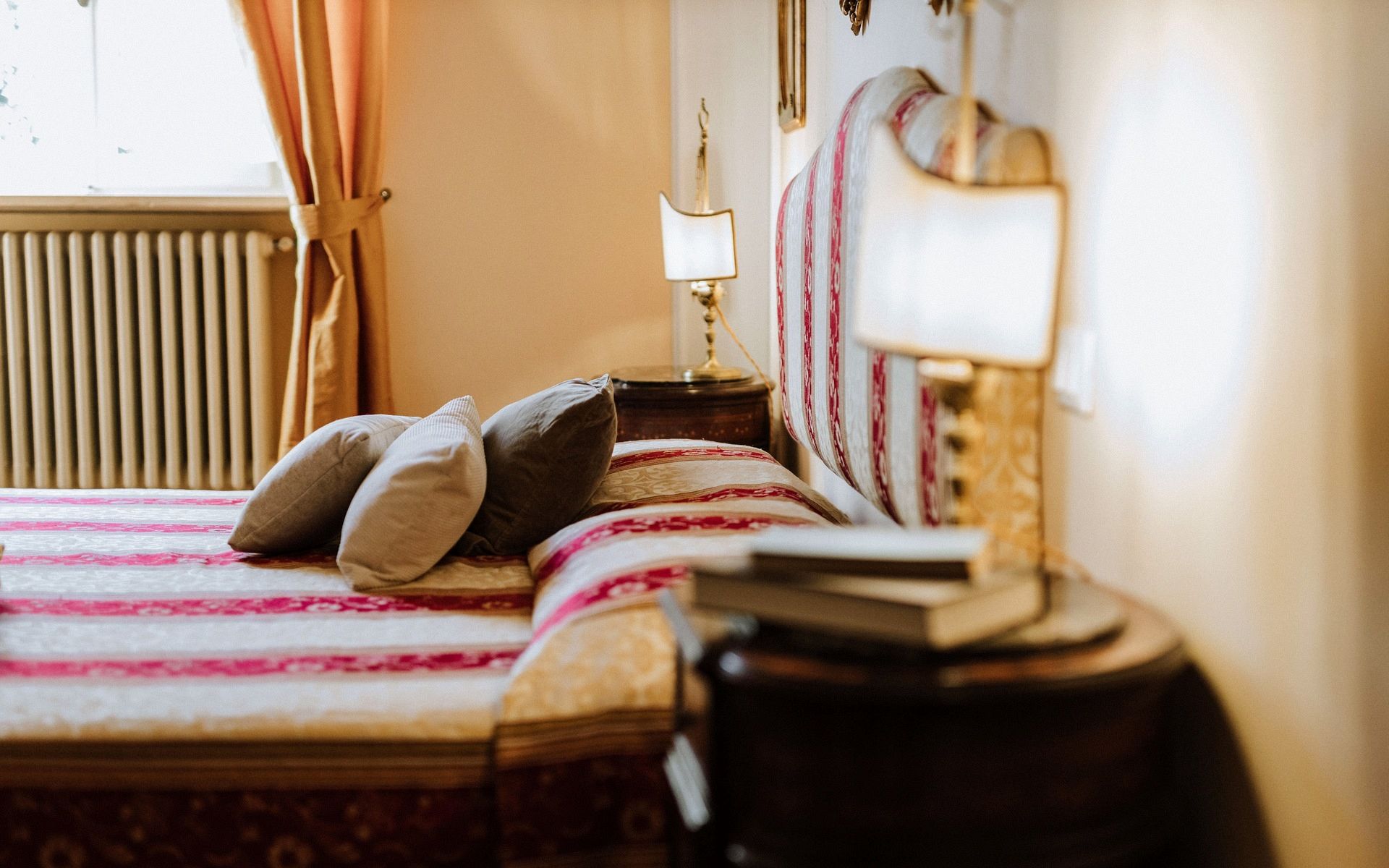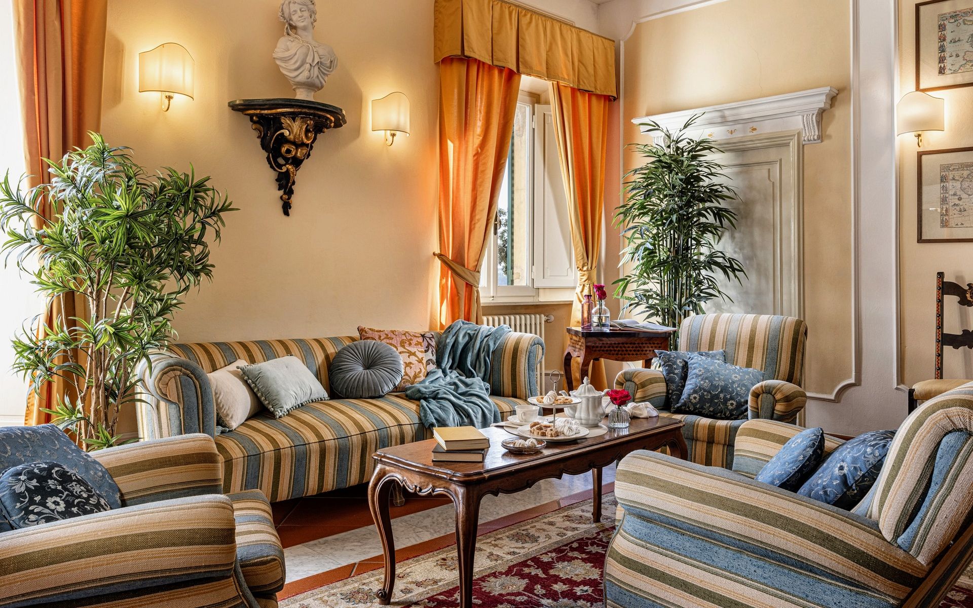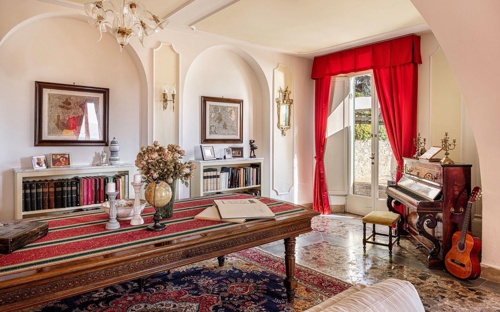On the first floor there is the sleeping area. There are six rooms, all equipped with air conditioning. Two rooms have king size beds and private bathrooms. Other two rooms have queen size beds and private bathroom. The last two rooms have a shared bathroom, one with a double bed and one with two twin beds. Each room is furnished with elegant furniture dating back to the eighteen century in order to preserve the charm of an elegant atmosphere.